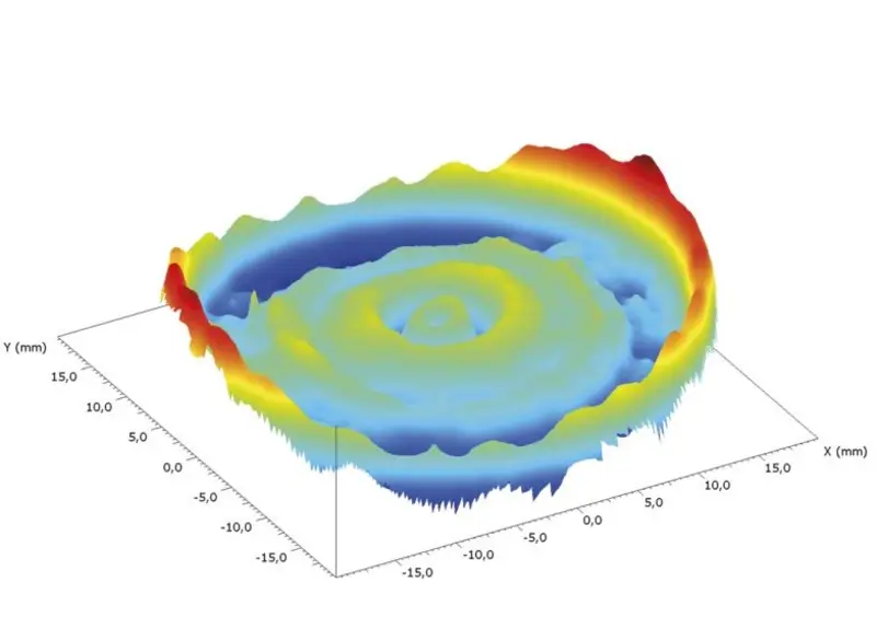 Diferenční topografie porovnání mezi naměřenými hodnotami a požadovanou charakteristikou čočky se znázorní jako barevně kódovaný obraz různých výšek. Dvojrozměrné řezy a diferenční topografii lze poté exportovat ve známých formátech pro účely korekce obráběcího stroje.