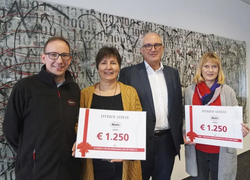 Ende Februar überreichte Stephan Gais den Spendenscheck an die beiden Vertreterinnen der gemeinnützigen Organisationen: Dagmar Hildebrandt-Linne, Geschäftsführerin des Elternhauses, sowie Barbara Möllmann, Pflegedienstleitung der Häusliche Kinderkrankenpflege Göttingen gGmbh – kurz KIMBU. Ebenfalls anwesend war Martin Bachmann, Mitglied im Vorstand des Trägervereins des Elternhauses und selbst Mitarbeiter bei Mahr.