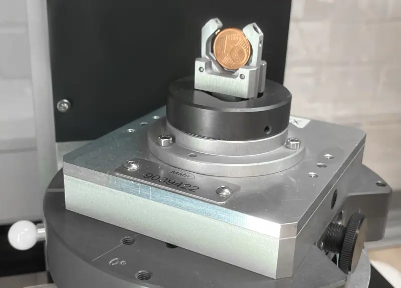 Among other things, the customer manufactures high-precision workpieces for hydrogen technology. In order to measure the workpieces fully automatically, they needed to be clamped securely and reproducibly on a five-axis positioner of the MarSurf CNC Series 1200 measuring station. For three very small components, one of them about the diameter of a one-cent coin, the company was looking for a way to clamp them with just one hand. Normally, the clamping of such filigree components requires two-handed operation: The operator inserts the part to be tested into the workpiece fixture with one hand and has to hold it in place until he closes the clamping device with the second and thus fixes the component – awkward and ultimately impossible for someone who is missing one hand.